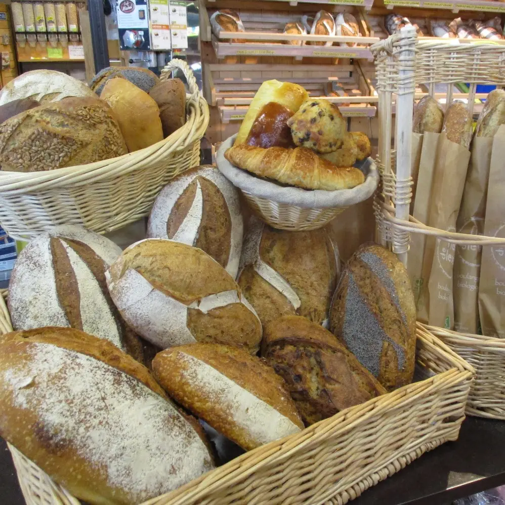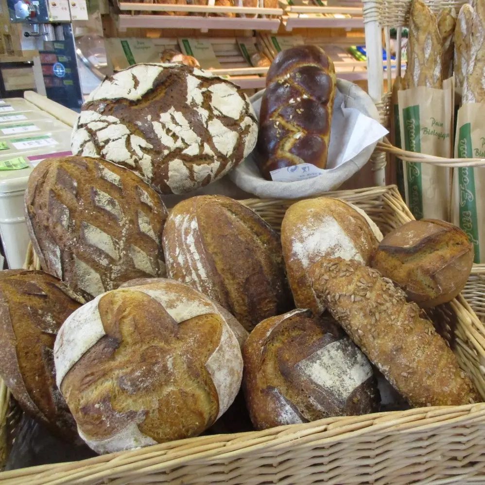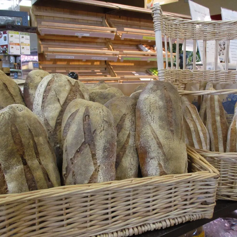 Pains complets T110, pains semi-complets T80, Pains blancs T65, Petit épeautre, Boule bi, Tourte au seigle, Pains aux céréales et fruits, Baguettes T80